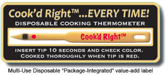 Our new Package-Integrated disposable cooking thermometers represent the first-of-their kind single use and/or re-usable temperature sensors which instantly and accurately communicate to consumers with a vivid color change when food is cooked to safe cooking temperatures as recommended by the USDA - for perfect doneness Every Time!
